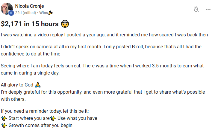 She made $2 171 in 15 hours and feeling grateful remembering how far she came.
